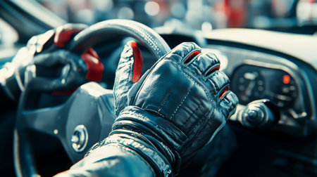 gloved hand firmly grips the steering wheel of a car, ready to take on the next challenge with precision and focus.