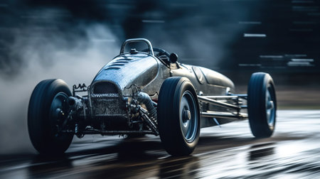 silver race car streaks across the frame, its wheels leaving trails, generated ai image