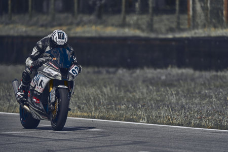 Super motorbike racing on the circuit track while driving at high speed and accelerating at full power AIG44