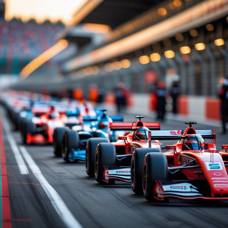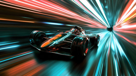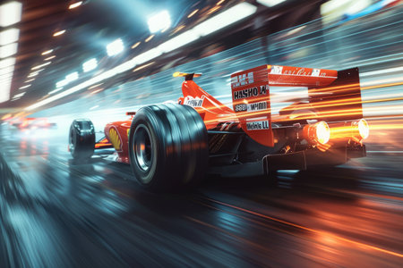 A stunning close-up image of a race car positioned on a track, showcasing intricate details, motion blur, and dynamic lighting that emphasizes speed and competition.
