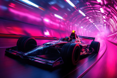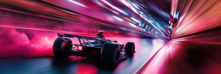 A futuristic race car accelerates through a neon-lit tunnel, leaving behind vibrant gasoline smoke in a dynamic display of speed and technology.