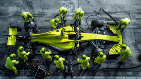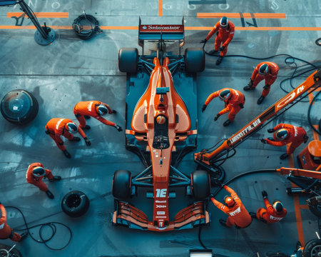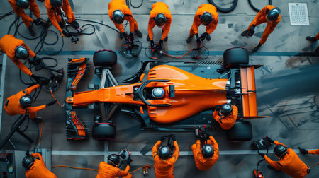 High-angle view of a Formula One pit crew working efficiently on a race car during a pit stop, highlighting teamwork and precision in motorsport.