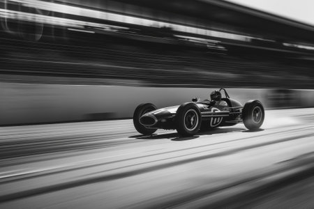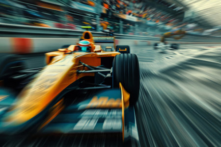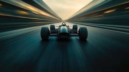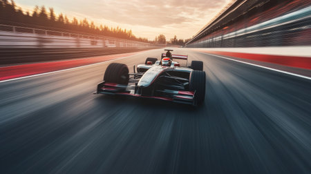 A high-speed racing car zooms along a track, with motion blur capturing speed, action, and competitive energy in motorsport.