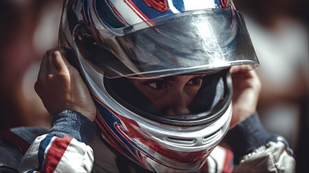 Racing driver wearing a helmet and suit, adjusting visor with hands, showing determination and focus during pre race preparation for motorsport competition