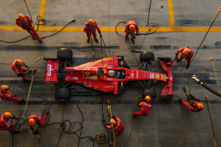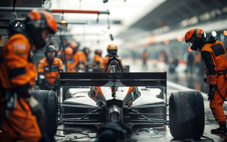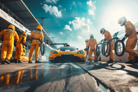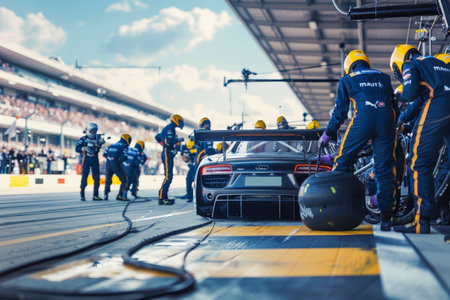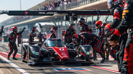 Efficient pit crew demonstrates ultimate teamwork during race car pitstop in the pit lane