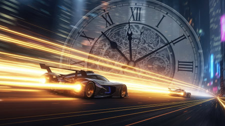 Two race cars speed along a track, leaving streaks of light against a blurred city backdrop. A large clock face dominates the composition, suggesting the concept of time. The scene is illuminated with dynamic lighting, creating a sense of speed and energy, suitable for commercial or editorial applications.
