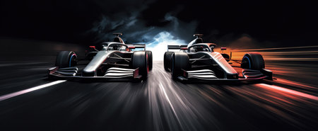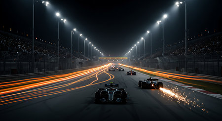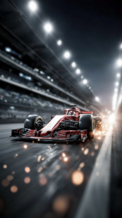 Formula 1 Race Car Speeding on Track with Sparks. Motorsport and Technology Concept.
