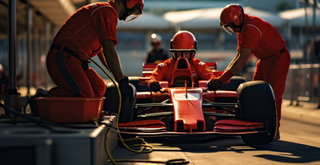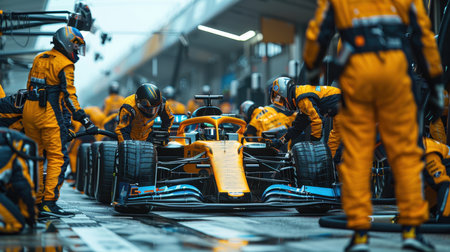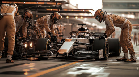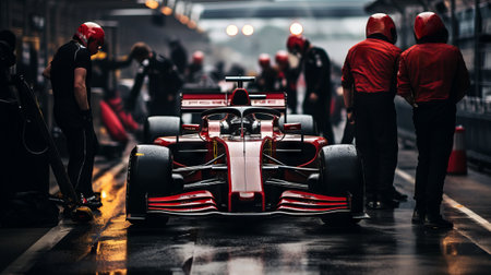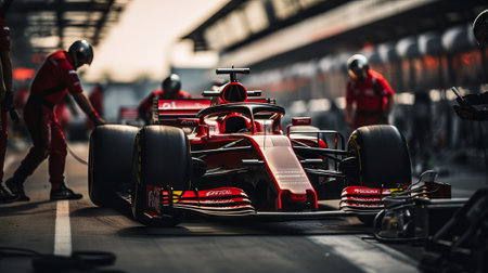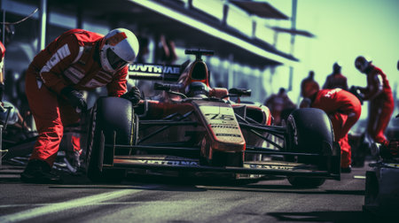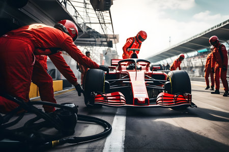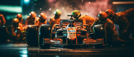 Formula 1 pit stop, accuracy and coordination of mechanics, quick service of a racing car. Generative AI
