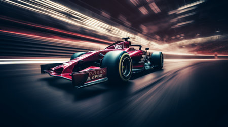 Formula one racing car at race track. Sport bolide with motion blur effect at motor sport grand prix. Created with Generative AI