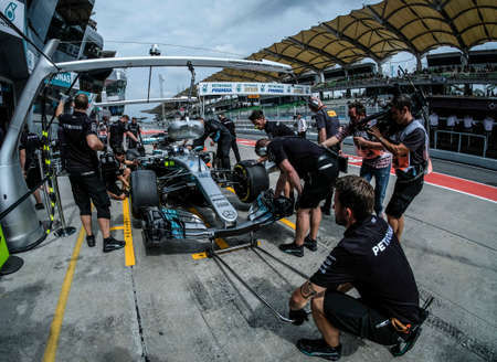 KUALA LUMPUR, MALAYSIA - SEPTEMBER 28, 2017 : Team mechanics work on Mercedes AMG racer Valtteri Bottas car at the garage during Malaysia Formula One Grand Prix at Sepang Circuit.