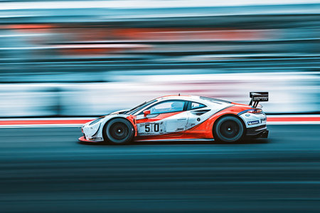 Cropped image of race car speeding on track. Sports car with motion blur effect at Grand Prix of motorsport