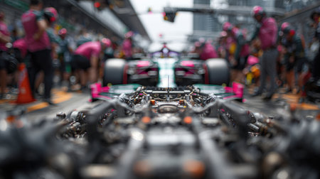 A detailed close-up of a racing car engine during a busy pit stop at a Formula One race. The image captures the energy and teamwork involved in quick maintenance.