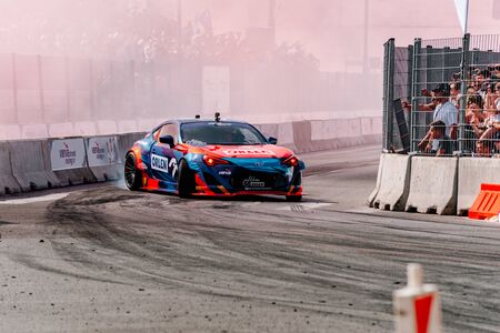 11-05-2022 Riga, Latvia Unknown rider on the car brand BMW driving drift car with smoke
