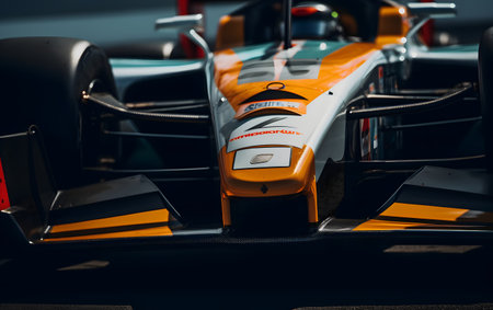 Formula 1 car racing on the circuit track while driving at high speed and accelerating at full power AIG44