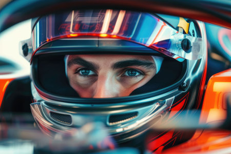 The picture of the formula one or f1 racer wearing the helmet for protection, the racing driver is focusing on the race track, the racer require skill like the concentration and driving skill. AIG43.
