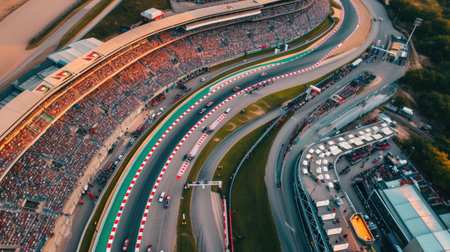 Aerial view of racing car driving car at race track surrounded with smart spectator cheering and watching the competition at grand stand. Top view of group of car racing along the race track. AIG42.