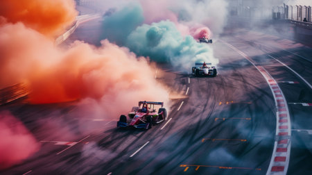 Colorful smoke trails left behind by fast-moving race cars as they speed around a racetrack, adding drama to the competition.
