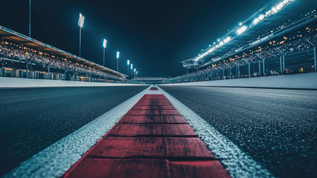 Long shot of racetrack lanes disappearing into darkness under stadium glow