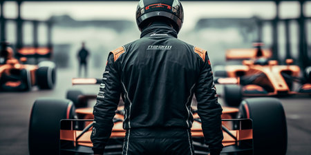 Formula 1 racer before the start of the race on the track in helmet and equipment view from the back against the background of the race car grandstands with the team. Banner copy space. Generative AI.