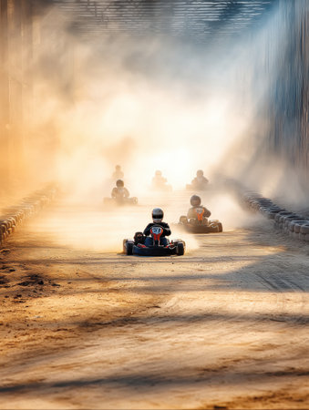 Go-karts race fiercely along a dirt track, creating dust clouds and showing thrilling speed under bright daylight in a vibrant outdoor setting.
