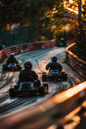 Helmeted racers race karts on an open track, feeling pleasure and excitement.