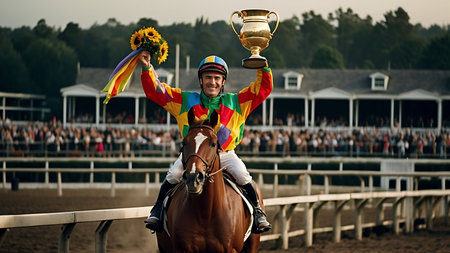 Jockey on horseback with golden trophy and winner cup at finish line