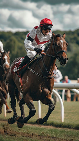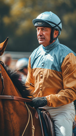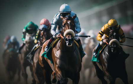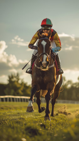 A close-up of a jockey in race gear, riding his horse with determination, showing focus and strength, ideal for horse racing advertisements