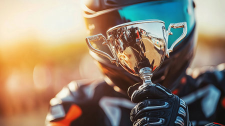 A motorcycle racer proudly holds a championship trophy against a stunning sunset backdrop. This image captures the exhilaration of victory in motorsport, showcasing the determination and passion of the athlete.