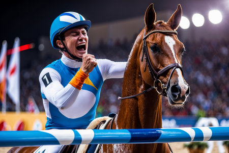 AI Generative Man jockey rider at hippodrome sports horse racing, summer Olympic games competition