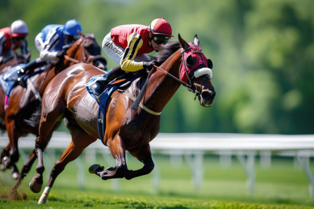 Jockeys are riding their horses during a fast paced horse race, creating a dynamic motion blur effect
