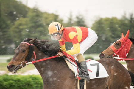 A racehorse with a jockey at the racetrack. Horse riding competitions.