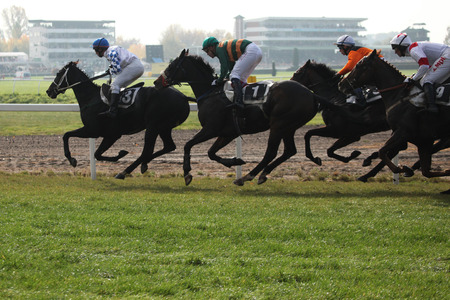 PARDUBICE, CZECH REPUBLIC - OCTOBER 13, 2013: Jockeys and their horses compete during the Velka Pardubicka Steeplechase, the toughest steeplechase in continental Europe, in Pardubice, Czech Republic.