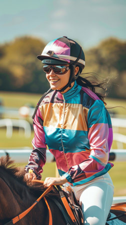 Female jockey in colorful racing attire riding a horse. Concept of woman athlete, horse racing, equestrian sport, competitive riding. Vertical.