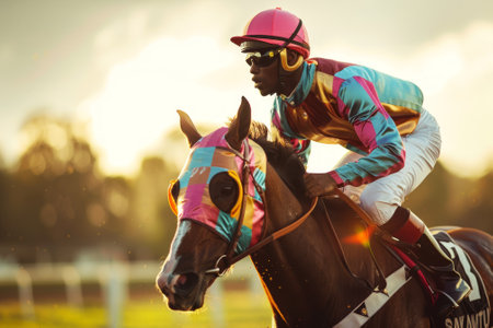 African American male jockey riding a racehorse during a race at sunset. Concept of horse racing, competition, equestrian sports.