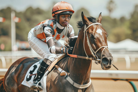 African American male jockey riding a racehorse on a racetrack. Concept of horse racing, equestrian sport, competition, athletic performance.