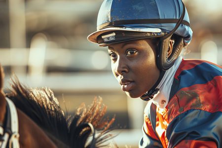 African American male jockey in racing attire with helmet at a horse race. Concept of horse racing, equestrian sport, athlete, competitive riding.