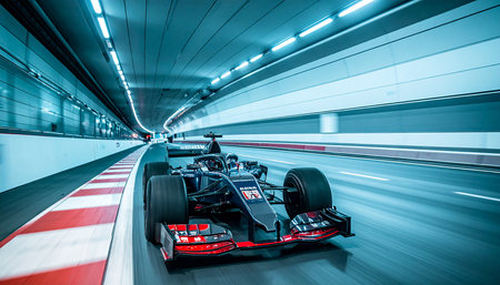 A dynamic painting showcasing a race car zooming through a tunnel with high speed. The car is vividly depicted with vibrant colors, surrounded by the dark tunnel walls creating a sense of motion and energy.