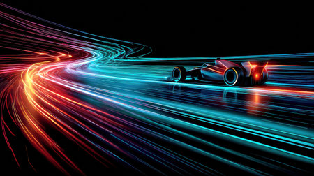 High-tech race car accelerates on a vibrant neon track, creating mesmerizing glowing trails in the darkness of night, showing a thrilling speed concept.