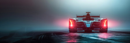 ultralow wide angle cinematic close up view of a race car speed in track at night raining misty hazy ai generated
