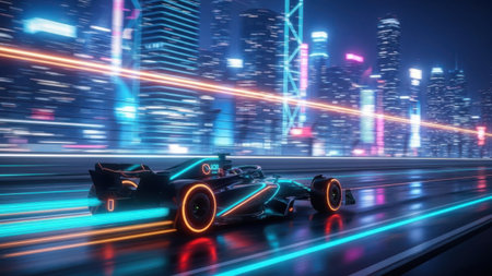 Futuristic, wireframe Formula 1 car racing through neon-lit city, representing high-tech and competitive nature of modern racing.