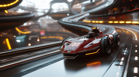 A realistic toy race car on a model racetrack, with dramatic lighting creating a competitive atmosphere