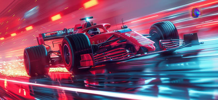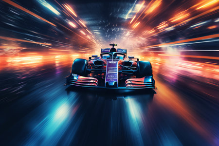 A high-speed Formula One car blurs past under vibrant neon lights, showcasing the adrenaline and excitement of night racing. The dynamic motion captures the essence of competition on the track.