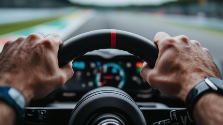 Hands grip the steering wheel tightly, feeling the power of the racing car. A speedometer shows high speeds as the driver navigates the track with precision on an overcast day.
