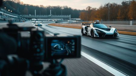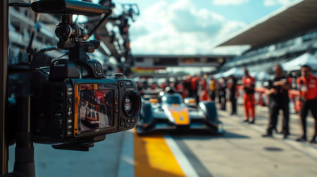 Race Car in Pits With Camera Equipment Capturing Action at Motorsport Event