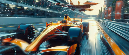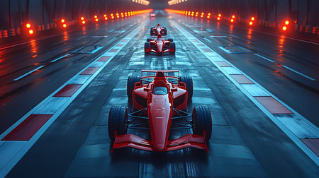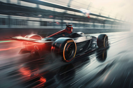 A stunning close-up image of a race car positioned on a track, showcasing intricate details, motion blur, and dynamic lighting that emphasizes speed and competition.
