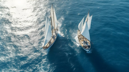 Aerial view of Sailing ship yachts with white sails in windy condition in deep blue sea