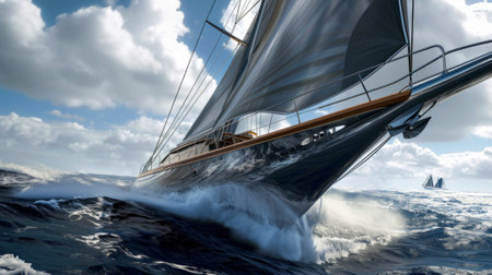 a yacht surfing through the waves, wind billowing its sails, as the crew embarks on an exhilarating ocean adventure in a remote and pristine setting