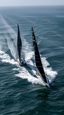 High-speed racing sailboats slice through the ocean waves, their sails billowing in the wind during a competitive regatta