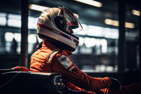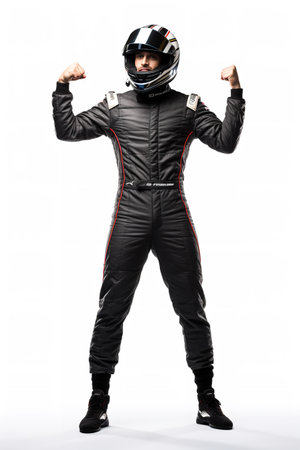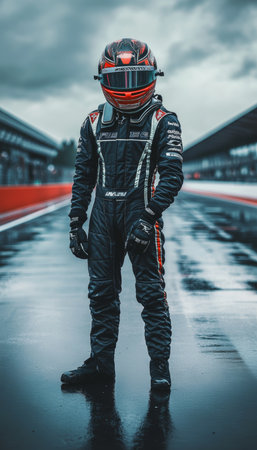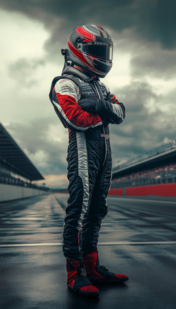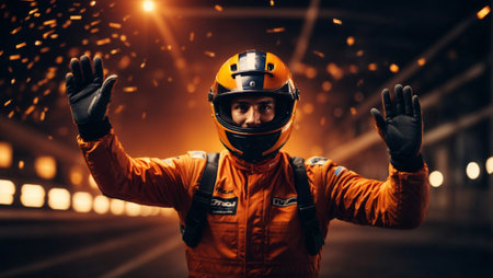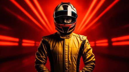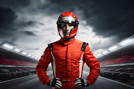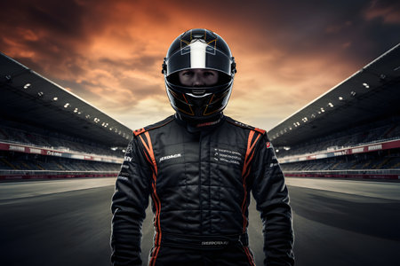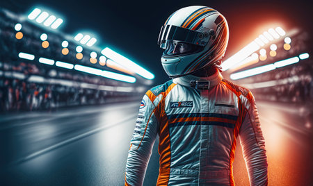 Portrait of a race car driver in full gear at the illuminated circuit, focus on safety and speed