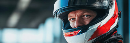 A determined racer wearing a helmet focuses intently on the upcoming race, showcasing passion and readiness at the racing venue.